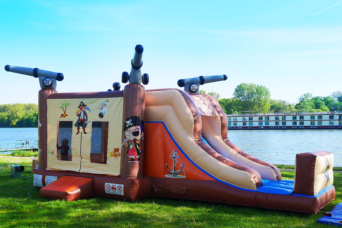 Ahoi, Piraten voraus! Unsere Piratenhüpfburg sieht aus wie ein echtes Piratenschiff und die kleinen Besucher Ihrer Veranstaltung werden mit dieser Attraktion zu waschechten Mini- Seeräubern. Das Piratenschiff ist ein toller Hingucker und lädt in ihr Inneres zum Klettern, Springen und Rutschen ein. Über eine Kletterwand gelangt man zu einer im Inneren verborgenen Rutschbahn. Damit dabei auch kein Kind über Bord geht, bietet eine integrierte Stoppwand ein sicheres Rutschen und Toben. Das Schiff ist aufwendig verziert, supersicher und einfach zu betreuen, da es rundherum geschlossen ist.